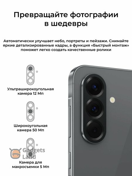 Экран: 6.7" (2340x1080) Super AMOLED; Встроенная память: 128 ГБ; Оперативная память: 8 ГБ; Тройная камера: 50 МП, 12Мп, 5 МП; Фронтальная камера 12Мп; Аккумулятор: 5000 мА·ч; SIM-карты: 2 (SIM); Операционная система: Android 15; Беспроводные интерфейсы: Bluetooth, NFC, Wi-Fi; Стандарт связи: 2G, 3G, 4G, 5G; Вес: 198 г